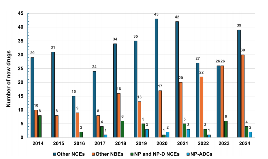 2014-2025 年 6 月,全球共批准 58 种天然产物相关药物,包括 45 种 NP/NP-D 新化学实体(NCEs)和 13 种 NP-ADCs。在 2014-2024 年全球获批的 579 种新药(388 种 NCEs、191 种新生物实体 NBEs)中,天然产物相关药物占 9.7%(56 种),其中 NCEs 占 7.6%(44 种),NBEs 中 NP-ADCs 占 6.3%(12 种)。这些药物年批准量波动于 0-8 种,年均 5 种,虽非研发主流,但产出稳定。值得关注的是,中国、印度等国的中小制药企业在天然产物衍生药物首次批准中的占比持续提升,成为核心推动力。