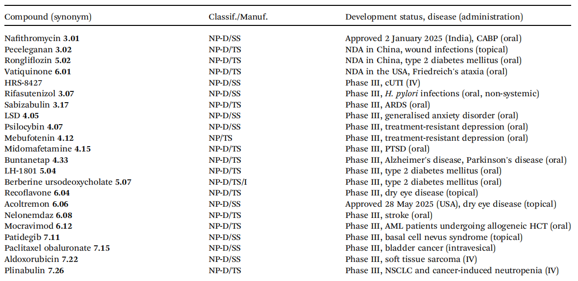 天然产物(NPs)是药物研发的传统基石,从古代草药到吗啡、奎宁等经典药物,应用贯穿医学发展史,20 世纪中叶迎来抗生素研发 “黄金时代”。但 20 世纪后期,合成化学、分子生物学技术兴起及生物制剂崛起,使其核心地位有所下降,但依然是多元研发手段之一。本文基于 2014 年 1 月至 2025 年 6 月全球药物审批数据及截至 2024 年底的临床试验信息,系统分析天然产物衍生(NP-D)药物的发展态势。文中明确天然产物为海洋、陆地植物、微生物等来源的纯小分子化合物(萜类、聚酮类等),排除初级代谢或营养功能分子;相关化合物分为 NP(天然产物)、NP-D(天然产物衍生)、NP-ADC(NP-抗体偶联药) 三类,制造方式含天然分离、半合成、全合成。